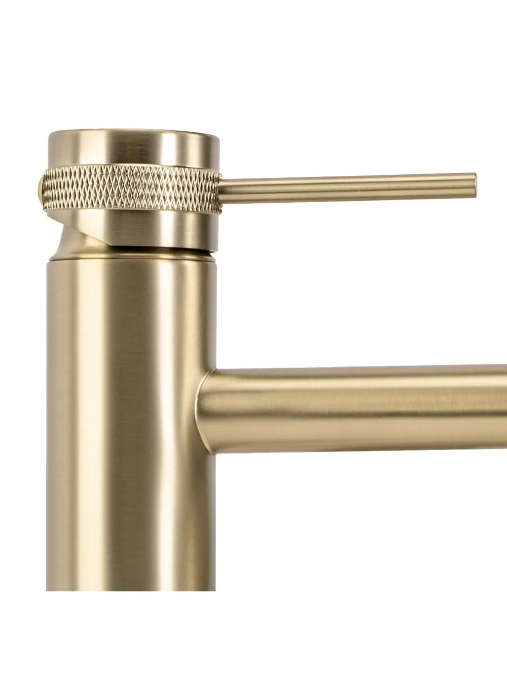 Bateria umywalkowa Lungo Grip Złoty Szczotkowany (wysoka) to połączenie nowoczesnego designu, elegancji i niezawodności. Jej smukła forma i delikatnie szczotkowane złote wykończenie wprowadzają do łazienki nutę luksusu i stylowego minimalizmu, idealnie komponując się z umywalkami nablatowymi.