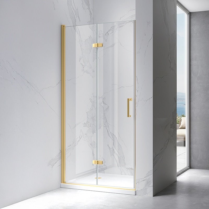 Wykończenie w kolorze złoto szczotkowane nadaje całości elegancki charakter, a szkło hartowane zapewnia trwałość i bezpieczeństwo użytkowania. Drzwi składane ograniczają przestrzeń potrzebną do otwierania, co dobrze sprawdza się w mniejszych łazienkach.