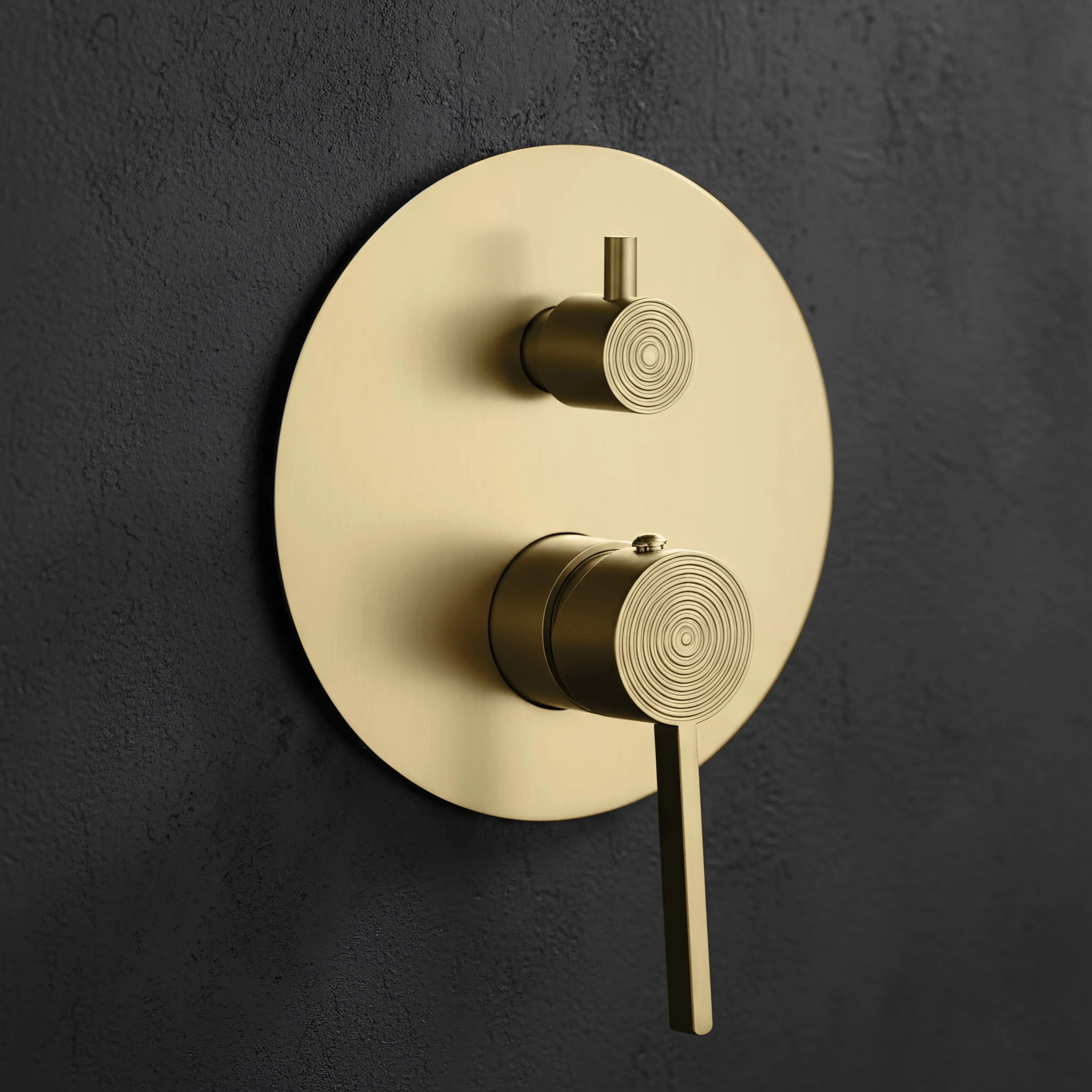 Serce zestawu stanowi solidny korpus wykonany z wysokogatunkowego mosiądzu, który zapewnia odporność na korozję, stabilność konstrukcji oraz długą żywotność nawet przy intensywnej eksploatacji. To gwarancja niezawodności i bezpieczeństwa użytkowania przez wiele lat. Całość uzupełnia eleganckie wykończenie w kolorze szczotkowanego złota, które dodaje łazience luksusowego charakteru, a jednocześnie jest praktyczne w codziennej pielęgnacji.