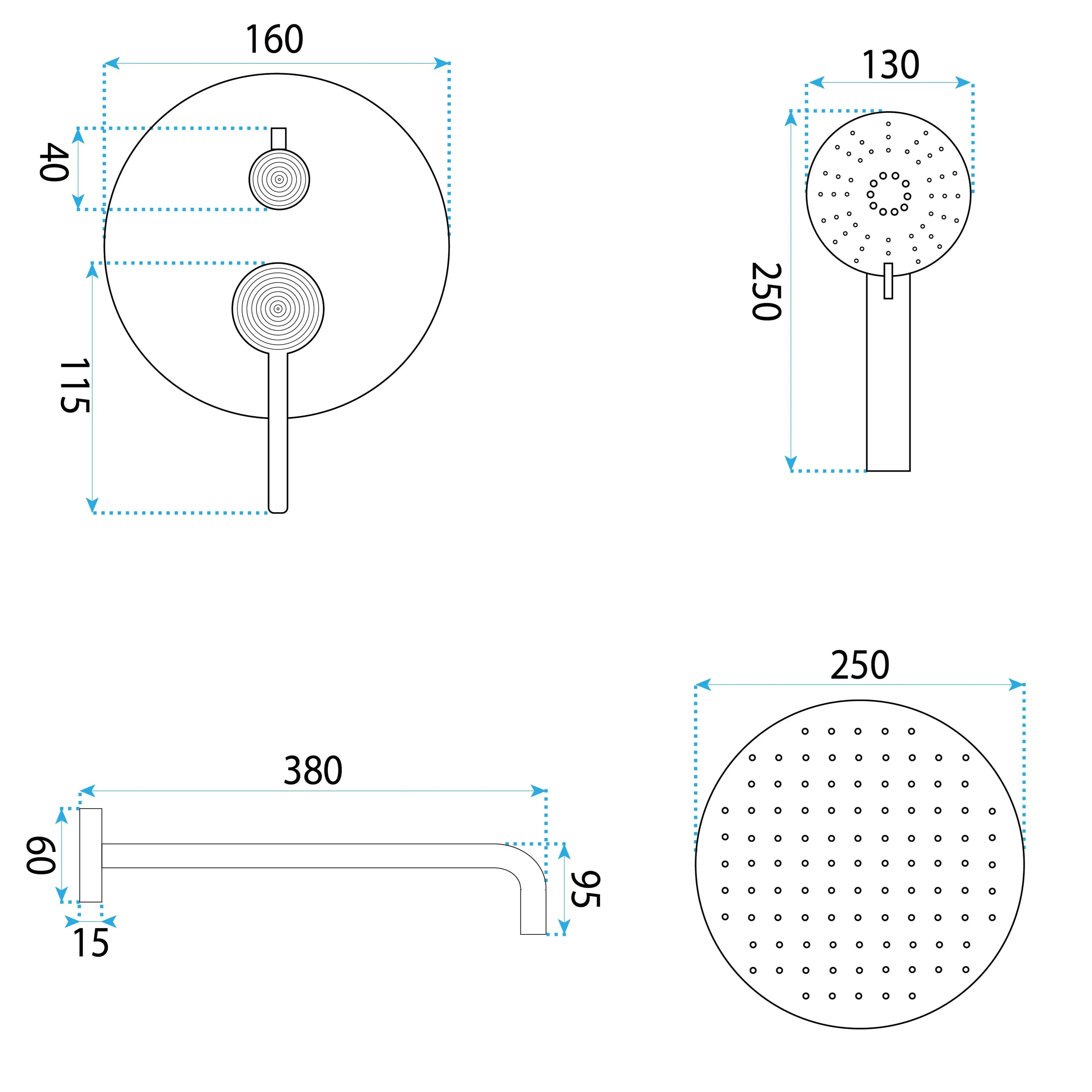- Skład zestawu: Bateria, deszczownica, ramię do deszczownicy, wąż 1500 mm, słuchawka, uchwyt na słuchawkę, maskownice, box podtynkowy